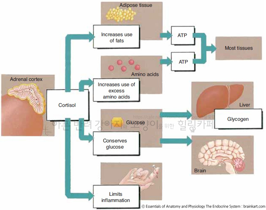 - 간에서 포도당신생합성 : 당신생 효소들의 합성을 자극해, 포도당합성을 증가시켜 혈당을 유지합니다. 개에서 코르티코이드가 과잉 분비될 때 ALP동종효소의 유도가 발견됩니다.