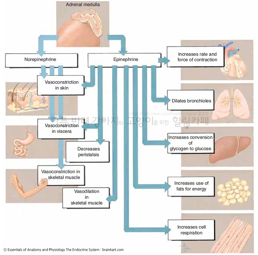 노르에피네프린은 교감신경 절후신경에서도 분비되지만, 노르에피네프린을 에피네프린으로 전환하는 PNMT가 대부분 부신수질에 있어서 에피네프린은 대부분 부신수질에서 분비된다고 할 수 있으며, 에피네프린과 노르에피네프린 분비 비율은 종마다 다르지만 대략 개는 EPI 70% NE 30%, 고양이는 EPI 60% NE 40%의 비율로 분비됩니다.