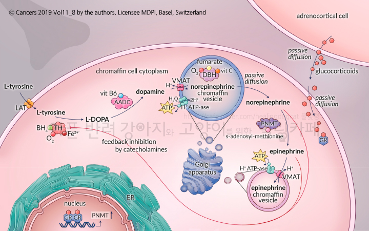 부신수질 크롬친화성세포질 내에 전달된 타이로신은 L-Tyrosine → 타이로신수산화효소에 의해 L-DOPA → 방향족 L-아미노산 탈탄산효소에 의해 Dopamin → 크로마핀립 속에서 도파민 β-수산화효소에 의해 Norepinephrine → 페닐에탄올아민 N-메틸전이효소(PNMT)에 의해 Epinephrine의 순서로 합성됩니다.
