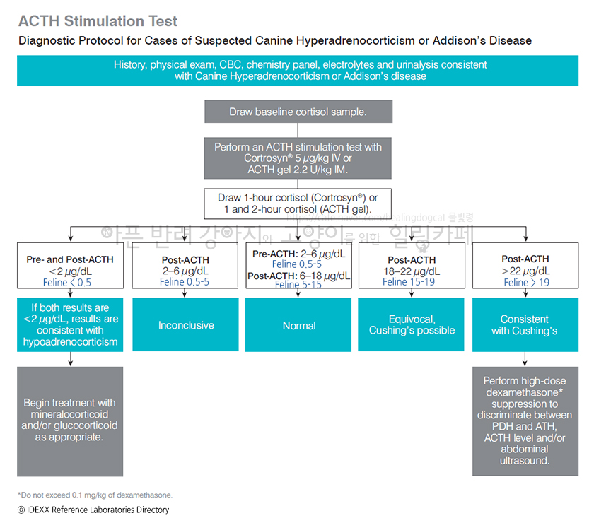 건강한 상태에서 혈장 코르티솔 정상범위는 개 1.0~6.0 ㎍/dL 고양이 0.3~8.8 ㎍/dL입니다.