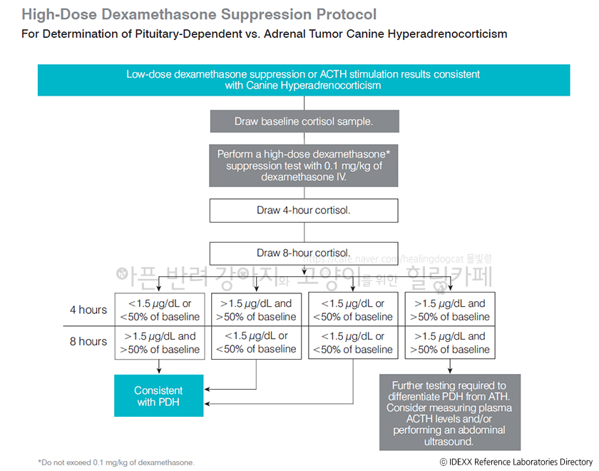 PDH에서 저용량 덱사메타손 억제에 저항하는 것으로 판단될 땐 HDDST (High-Dose Dexamethasone Suppression Test, 고용량 덱사메타손 억제검사)를 진행합니다. HDDST에서도 일부는 저항할 수 있습니다. 고양이는 개보다 억제가 쉽게 되지 않아 LDDST가 아닌 HDDST로 진행해야 한다는 주장이 있고, 임상에서도 HDDST가 권장되는 편입니다.