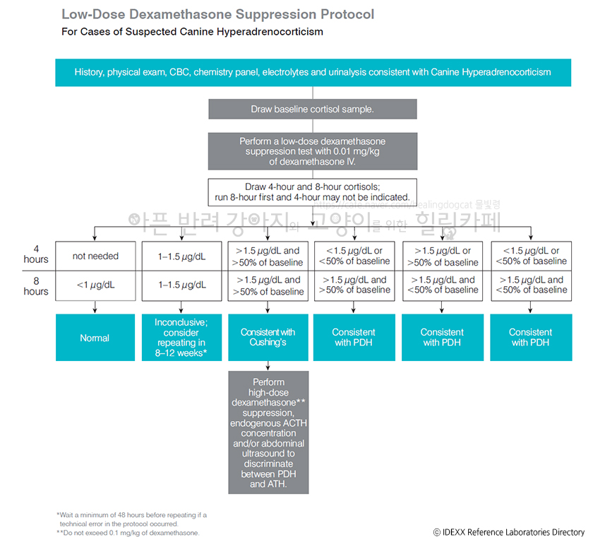 징후가 없다면 부신피질기능항진증 가능성 낮음, 징후가 있다면 부신피질호르몬 이외의 원인을 찾을 것, 부신피질호르몬 이외의 원인을 찾지 못할 경우 ACTH ST, 복부초음파 등 추가 검사 고려하거나 8~12주 후 LDDST 재진행